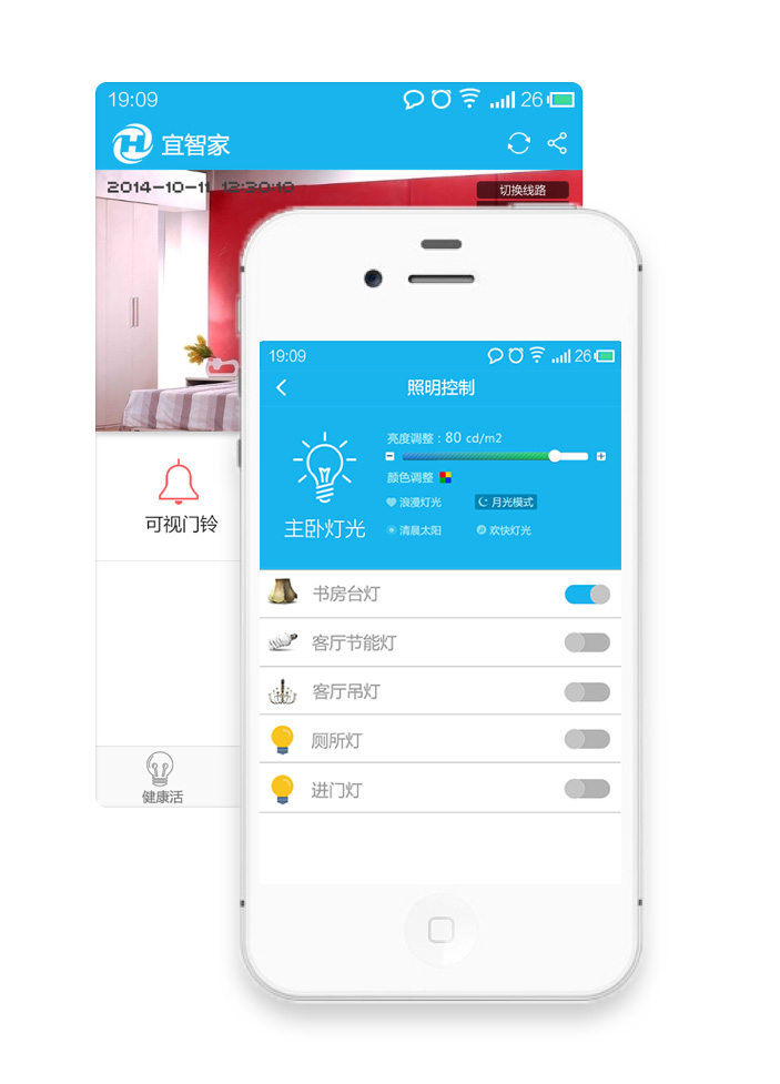 • 照明控制:書房臺燈、客廳節(jié)能燈、客廳吊燈、廁所燈、進門燈